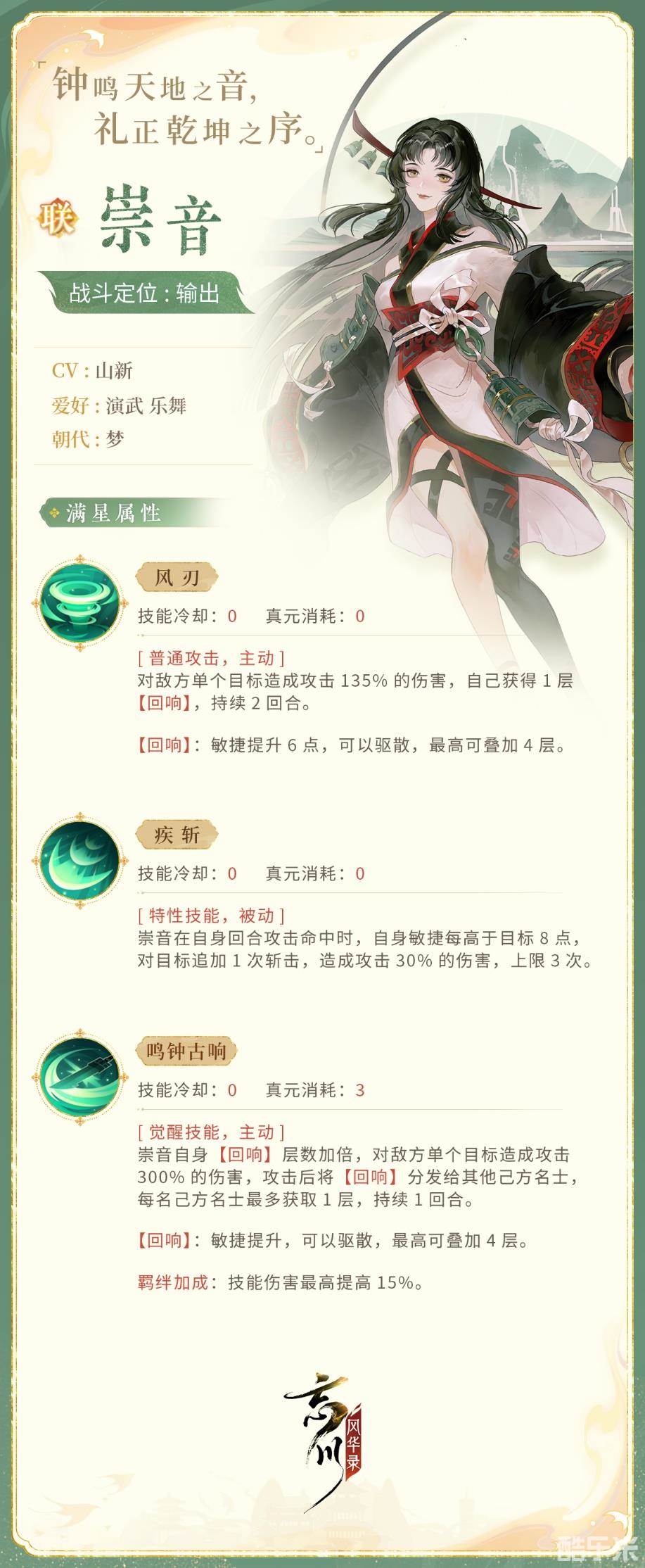 崇音作为联动秘灵,在战斗中作为输出出战!她以技能【风刃】为普通攻击,【疾斩】为被动技能,【鸣钟古响】为觉醒技能,触发羁绊时技能伤害最高提高15%,强力输出一招制胜!