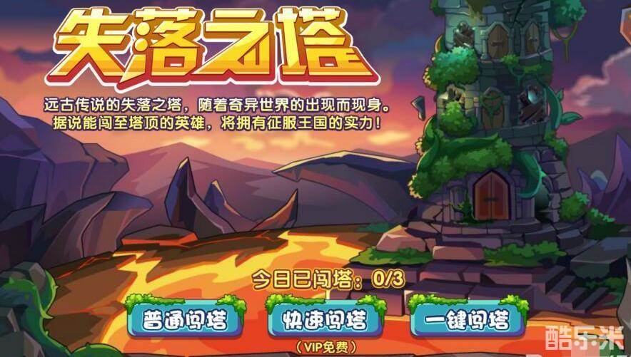 失落之塔位置并不难找,进入游戏,点击【王国城堡】左侧图标,进入区域地图,点击下方的【失落之塔】,点击中央的塔建筑即可去选择【普通闯塔、快速闯塔、一键闯塔】,选好进入塔内。