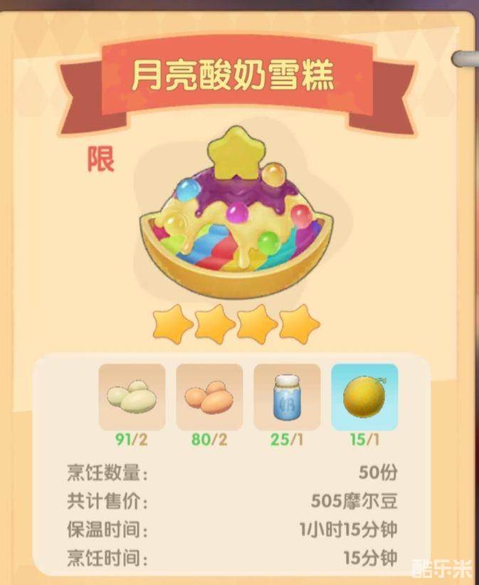 月亮酸奶蛋糕菜谱需要2鸭蛋,2鸡蛋,1牛奶和1哈密瓜。这些材料的成本相对比较高,而且对动物养殖要求很高,日常养动物少的玩家容易出现材料不足的情况。