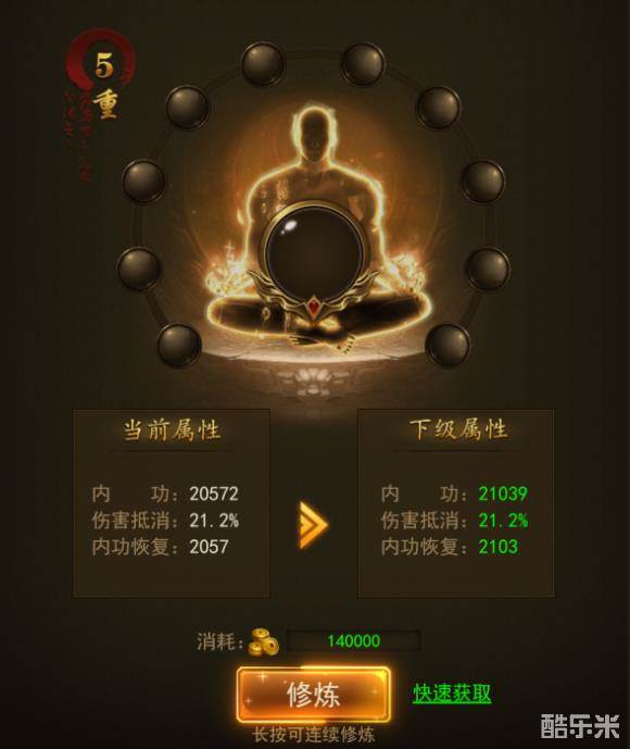 这个就是内功修炼的主界面了,可以看到当前的属性提升,以及伤害抵消量。比如小编只拥有20%的山海减免量。我们的金币只要足够就可以点击修炼来提升属性啦。金币不够的话可以在这里直接购买金币。