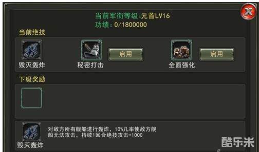 《决战大洋》中军衔共分为16个级别,最高等级军衔为“元首”,玩家积攒功绩便可提升军衔等级。军衔的提升决定着玩家当前可雇佣到珍惜等级更高的军官以及越来越强大的绝技,最高等级的“元首”军衔甚至可以招募到二战时被誉为“蛮牛”的蓝色将领哈尔西;毁灭轰炸、秘密打击、全面强化这三大神级绝技甚至能决定战争胜负!