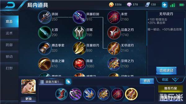 解析:末世可以帮助虞姬在后期解决攻速不够的问题,末世的被动令普攻附带敌人当前生命值一定百分比的物理伤害,使得虞姬与坦克单挑也不落下风。末世附带的吸血效果也能增强虞姬的续航能力;无尽战刃提供的暴击率和增加的暴击效果,能在大后期进一步提高虞姬的爆发能力。