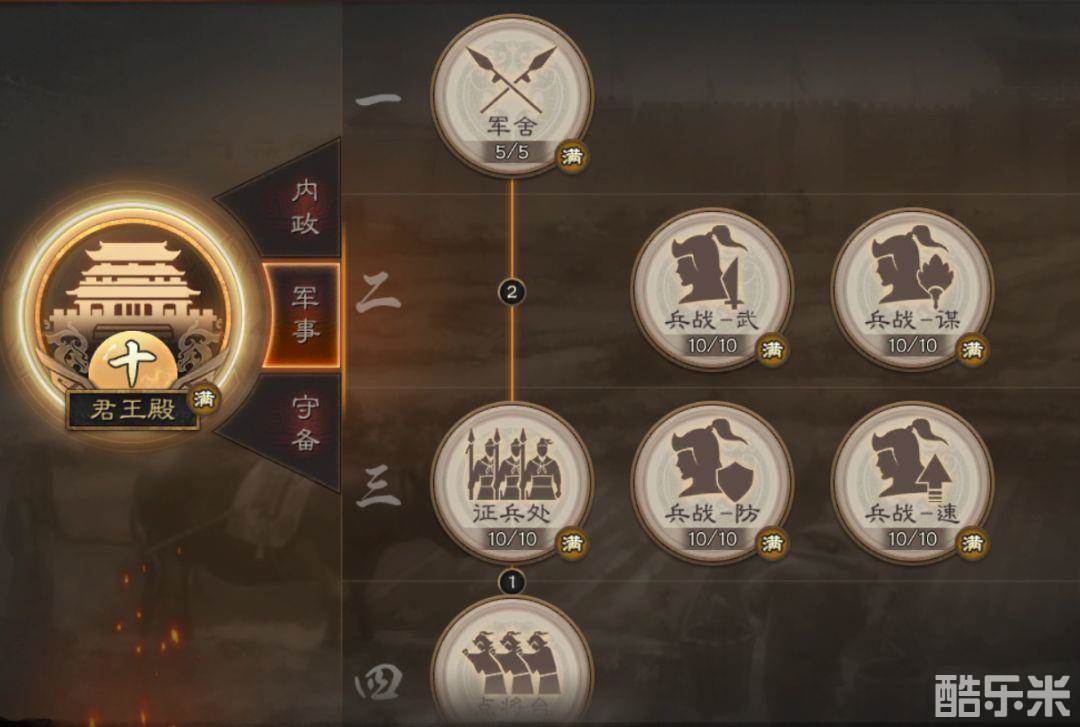 因此在“上山前”,君王殿最好升到10级,内政中的民居、仓库,军事中的建筑,守备中的士气坛都尽可能升满,俗话说“工欲善其事必先利其器”,城建设施越完善,上山以后压力越小。