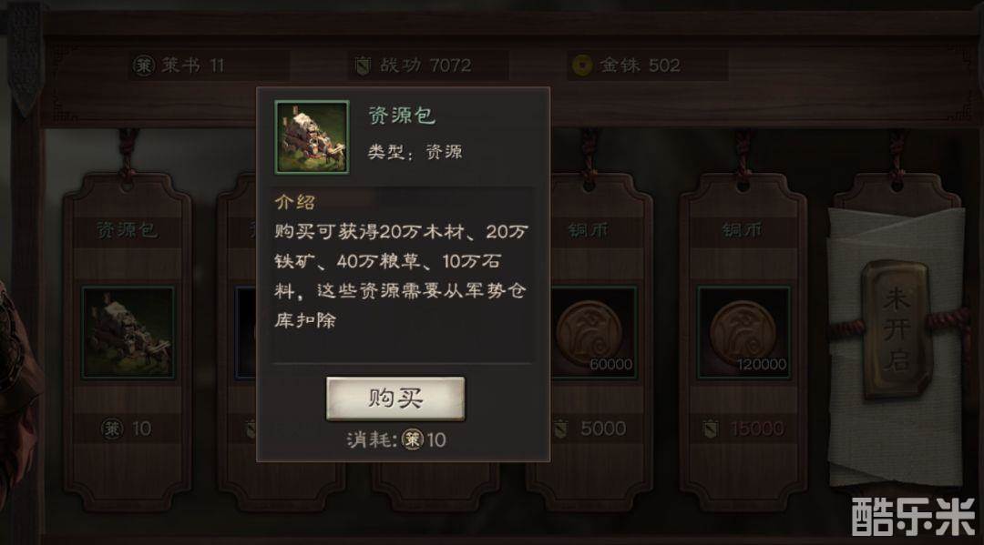 5、前面说过,每天花费10个策书可在军势购买资源包,但是当军势仓库资源不足,无法购买资源包的时候怎么办?这时候我们可以查看一下军势仓库所缺的资源数量,如果缺的数目比较少,我们可以自己手动捐一点,补齐到可购买的程度立马购买。每天花费50金铢可刷新一次军势商店。