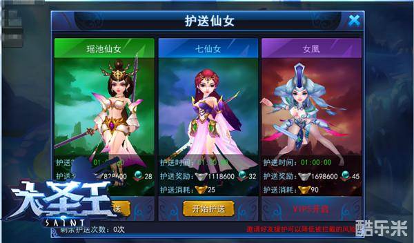 从瑶池上,玩家可以护送3位仙女下凡。在护送界面,分别是瑶池仙女、七仙女和女凰,各个仙女护送花费也不一样,瑶池仙女免费,最为实惠。而七仙女需要花费少量的元宝,女凰需要较多的元宝加一定的VIP等级才能护送。护送花费的越多,护送成功得到的奖励也更丰厚。并且在特定的时间内(11:00~12:00,18:00~19:00)护送仙女会获得双倍的收益,当然这些时段的拦截和护送比拼也最为激烈。