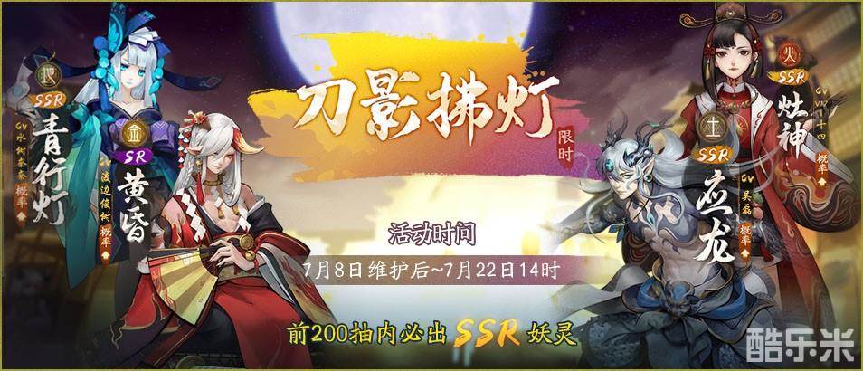 在限时开启的“刀影拂灯”卡池与妖灵卡池中,大人们还可以召唤到SSR妖灵青行灯、灶神、应龙以及SR妖灵黄昏等人气妖灵,此外还有限定活动拓印幽蝶舞光与青灯夜话等惊喜,召唤概率均将大幅提升。