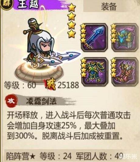 (王越比较特殊,升4星获得进阶兵种,觉醒才能获得技能进阶。)开场释放,进入战斗后每次普通攻击会增加自身攻速25%,最大叠加到400%,并且无视闪避。脱离战斗后加成被重置。