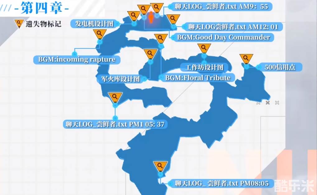【发电机设计图】光点(遗失物品)的位置在下图所示处,第4章BOSS战的机场前,一堆废车的位置处。