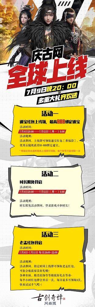 从7月9日20:00至7月12日(周一)6:00,开启时长限免!时长限免活动期间,登录游戏不扣时长,随心所欲畅玩古网!