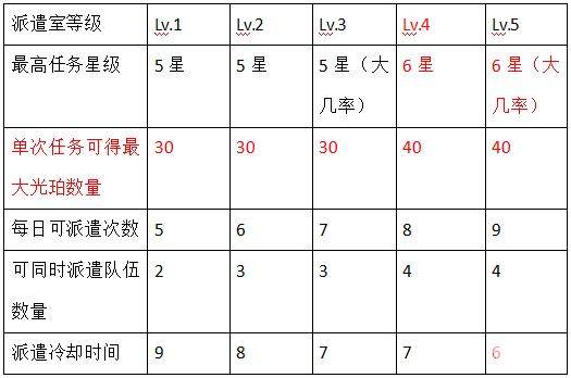 从上图可知,等级越高的派遣室,可获得的光珀数量越多,所以派遣室等级也要尽早升高。