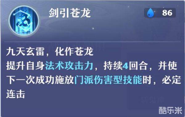 青云门触发连击效果主要是依赖核心技能剑引苍龙,该技能在使用后会在4回合内提升法术攻击力,并且让下一次伤害技变为连击,因此一般是搭配其他buff效果一同使用。