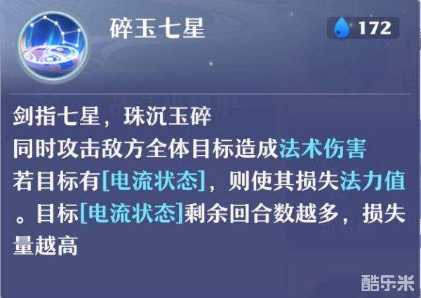 青云门伤害最高的技能当属碎玉七星,这也是和剑引苍龙技能最为搭配的伤害输出技能,使用后对敌方全体造成高额伤害,如果有电流状态还会造成法力损毁效果。