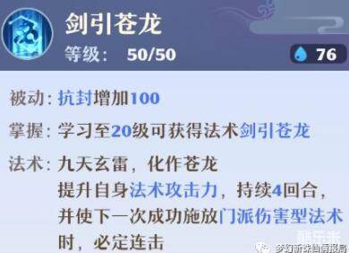其次就是【剑引苍龙】,对于青云门来说也是非常主要一定等级的技能,释放之后就说明马上就要打出一个高爆发了,并且法术攻击提升的加成效果能够持续4个回合,在准备释放大招之前先用一下这个技能,接下来就能够打出高额伤害,使得对方必须要用封印技能。