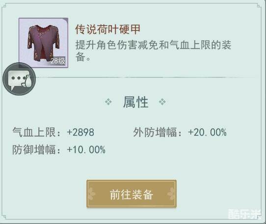 传说级别的荷叶甲效果是增加两千九的气血,外功防御增加20%,整体防御增加10%,最后等于外功防御增加了30%,内功防御增加了10%。