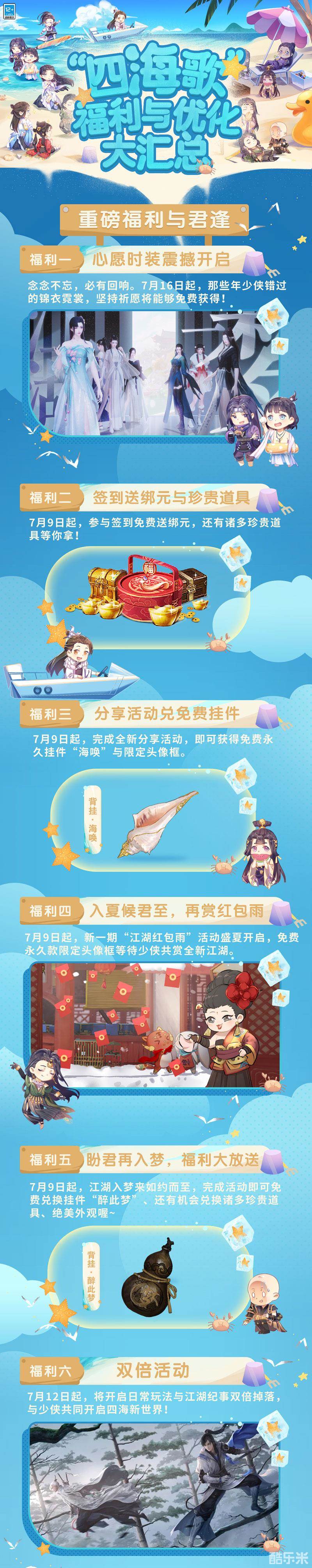 心愿时装、珍贵道具、红包雨、免费永久挂件.......7月16日,《一梦江湖》全新暑期资料片“四海歌”即将与大家见面!新门派泠音的出尘脱俗让人心动,天下宗师中的侠士们也正等待着成为大家的门人,还有南海新地图期待大家来冒险。在此,《一梦江湖》为大家准备了丰厚的福利,一起来看看!