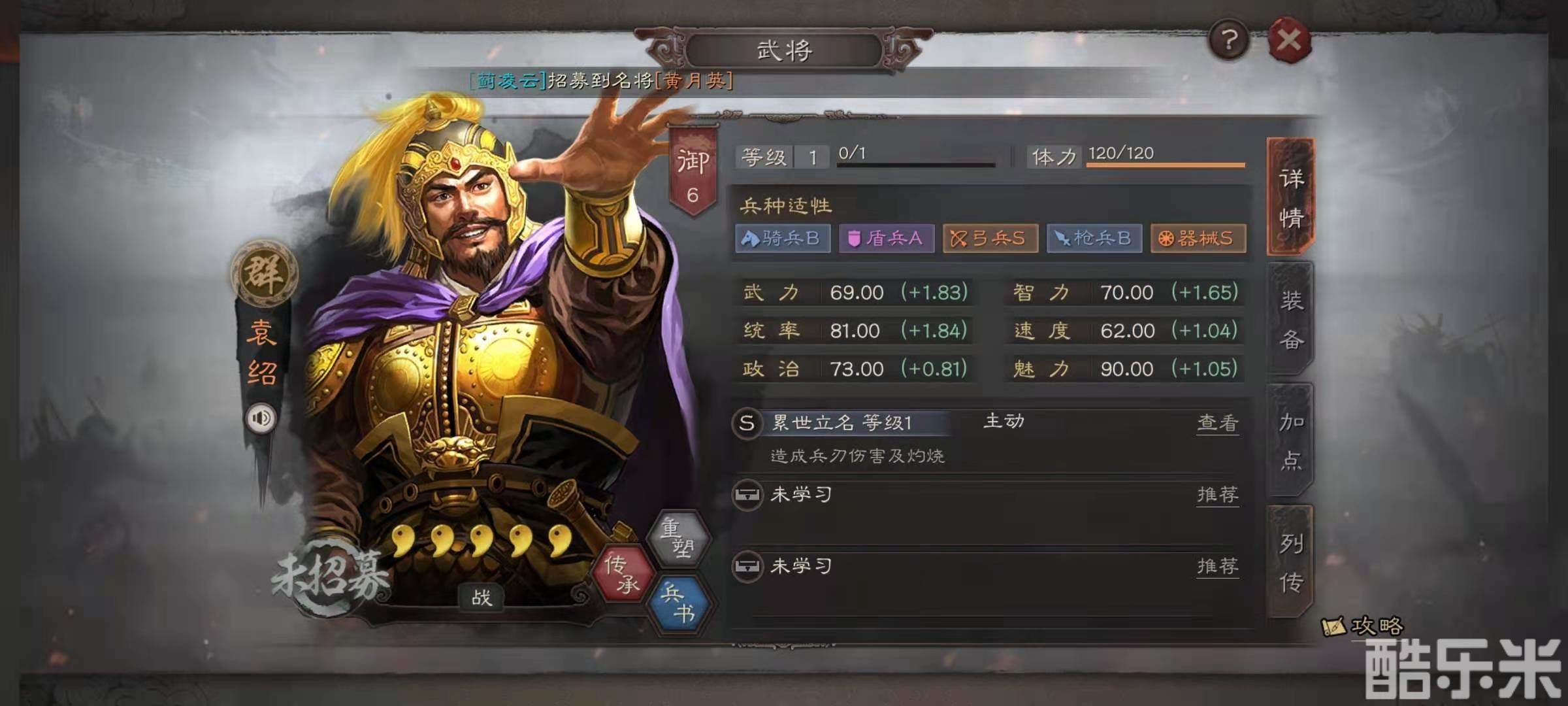 袁绍的自带战法是累世立名,效果是准备一个回合之后,对敌方全体造成一次兵刃伤害,降低伤害目标的统率值,并且附加灼烧状态。被灼烧的目标每个回合是受到持续伤害,如果袁绍的是主将的话,则提升己方全体武将80点统率值,这也是袁绍作为主将最大的意义,极大地提升了队伍的生存能力。除了袁绍外,另外两个副将选择文丑和吕绮玲。