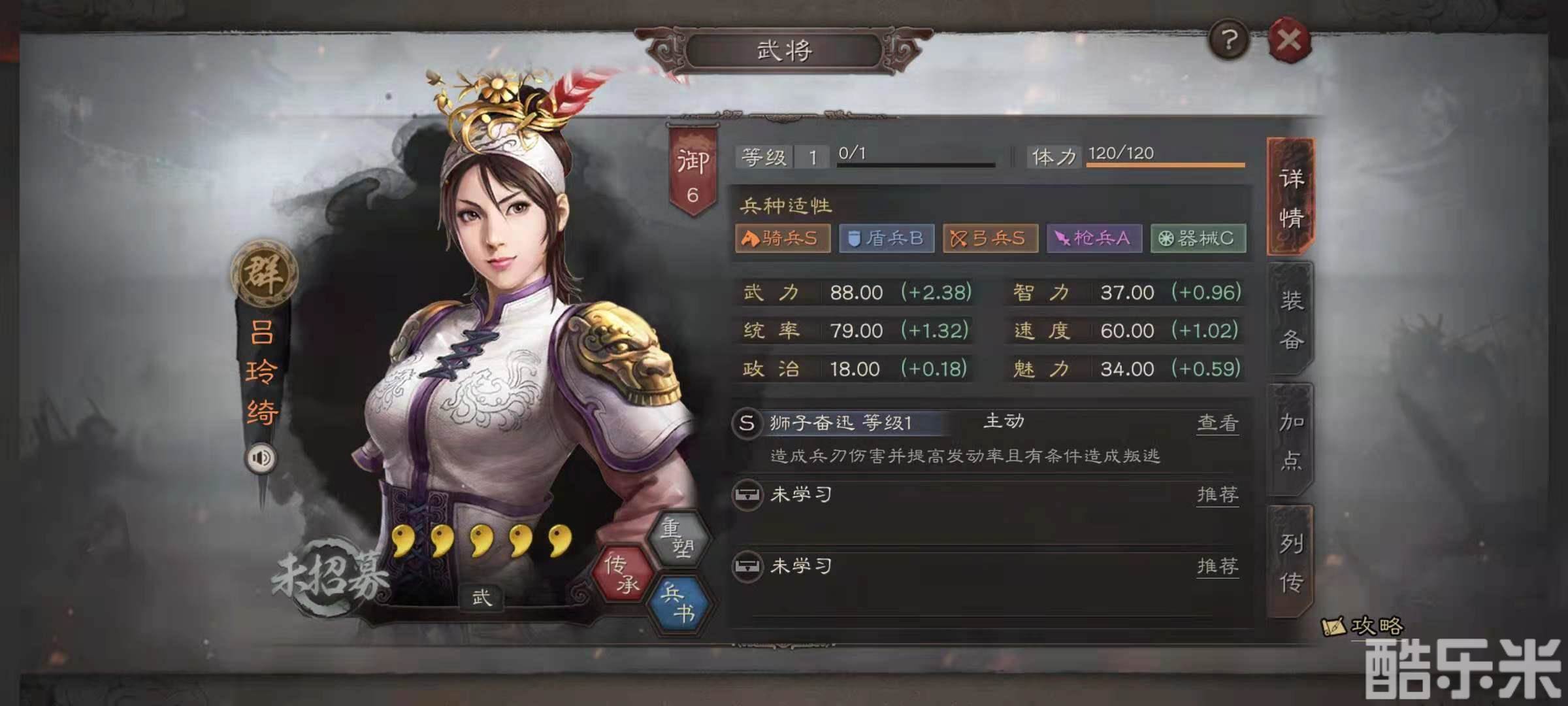 吕绮玲的自带战法是狮子奋迅,效果是对敌方单体武将造成兵刃攻击,并且提升自身主动战法发动几率,如果伤害的目标是敌方主将的话,则额外造成主将叛逃效果。