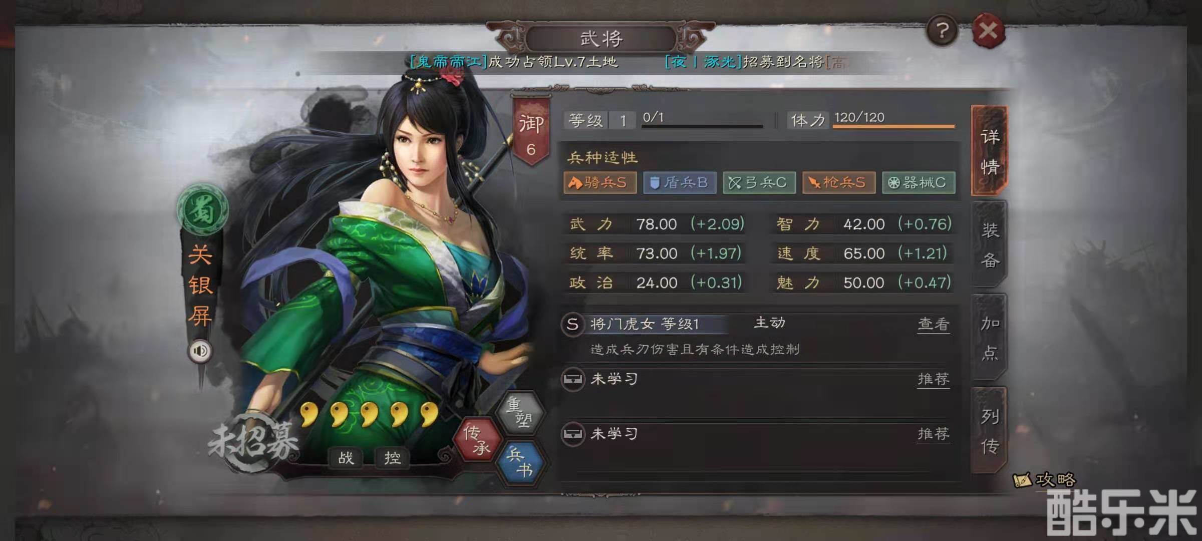 关银屏是这一套震慑枪玩法的输出核心,关银屏的自带战法将门虎女,效果是对敌方群体两名武将造成兵刃伤害,并且触发虎嗔效果。在下一个回合,被虎嗔影响的目标会额外受到兵刃伤害,而且每次受到伤害还会叠加额外伤害率,如果目标在虎嗔的持续回合内受到了三次伤害,则结算虎嗔效果,造成一次额外的震慑效果,提升关银屏的兵刃输出。关银屏的这个战法效果比较复杂,但是大家只要知道,这是一个攻击三次就能必定震慑的技能就可以了。