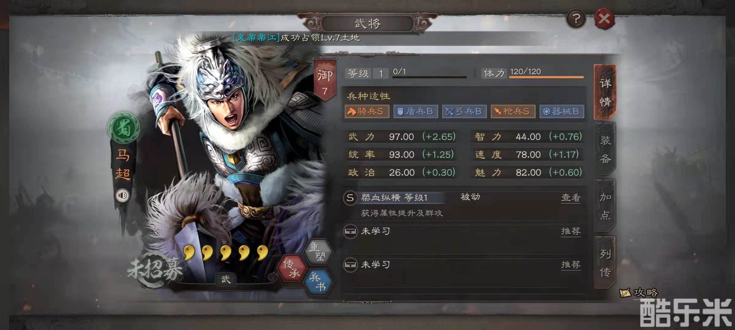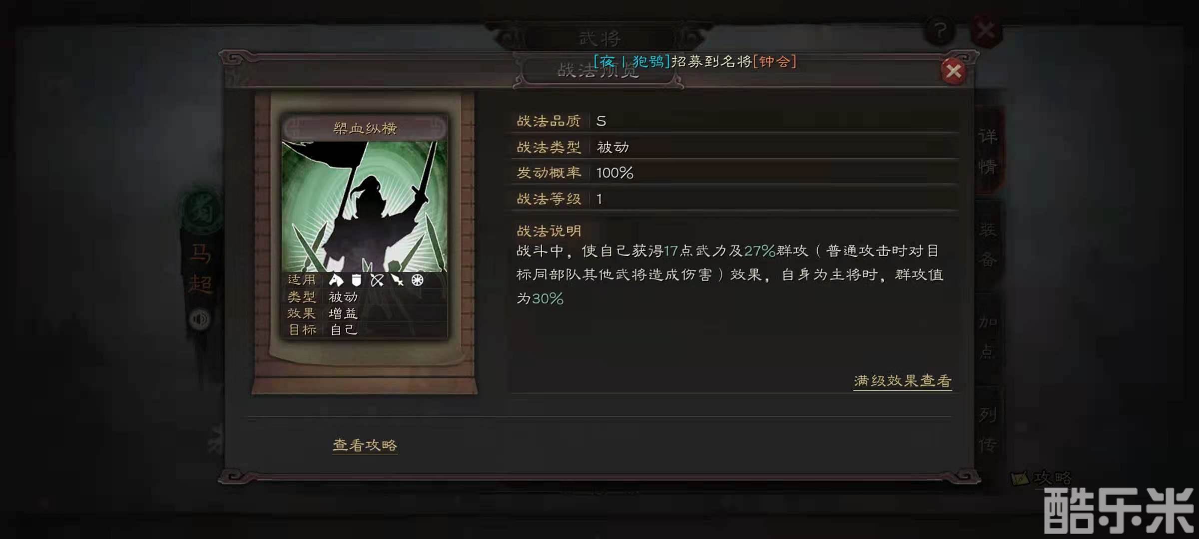 嗔目横矛的效果是提升自身武力值,并且获得群攻效果,可以造成多人伤害。马超的自带战法槊血纵横,效果是替身自身武力值,并且获得群攻效果,搭配的战法是破阵摧坚和盛气凌敌,利用盛气凌敌的缴械类为关银屏辅助。