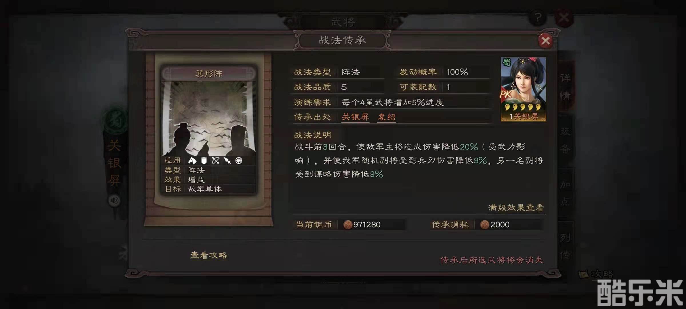有了这个震慑效果,另外的两个战法选择横扫千军和嗔目横矛,其中横扫千军的效果是对敌方全体造成兵刃伤害,并且如果目标已经被缴械或是技穷,则有几率造成震慑效果。