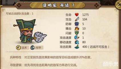 谋士作为远程兵种,在被近身的时候是不能够进行反击的,一般用作在后排对付敌人的盾兵。