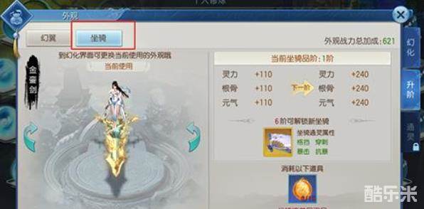 在外观系统中,玩家可以看到坐骑升阶页签,点击便可进入,就以小编目前拥有的金銮剑来为大家进行解释。