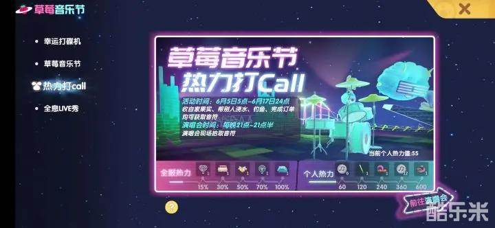 在6月5日到17日晚上九点到九点半,来到阳光沙滩参与草莓音乐节,拾取音符获得个人热力值,也可以种植音符种子获得个人热力值,个人热力值累计获得600时,可免费获得三角钢琴组合;