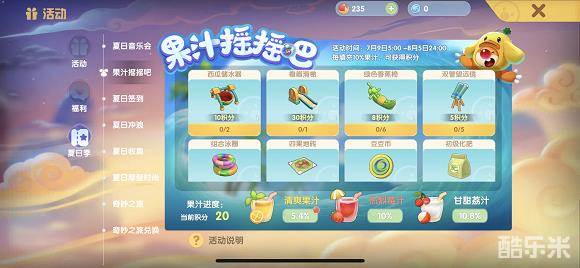在这个果汁摇摇吧活动中,玩家可以通过填充果汁来获得积分,一共有三种不同类型的果汁,其中: