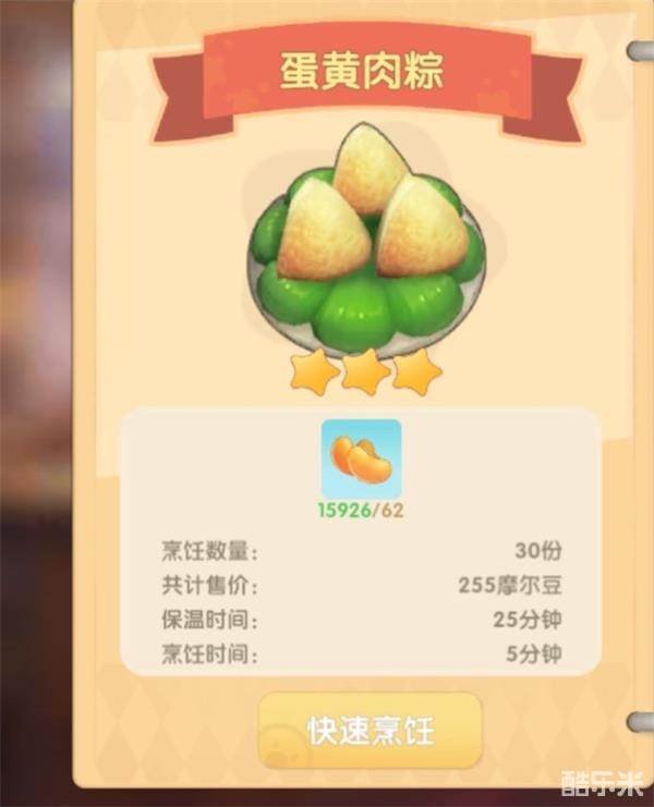 蛋黄肉粽一次30份赚255摩尔豆,一份8.5摩尔豆。成本62摩尔豆。