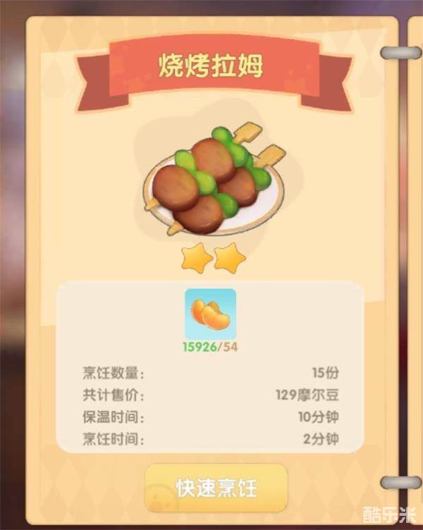 烧烤拉姆一次15份赚129摩尔豆,一份赚8.6摩尔豆。成本54摩尔豆。