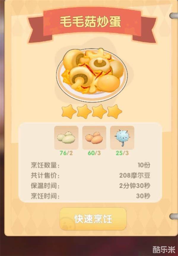 毛毛菇炒蛋一次10份赚208摩尔豆,一份20.8摩尔豆。成本89摩尔豆。