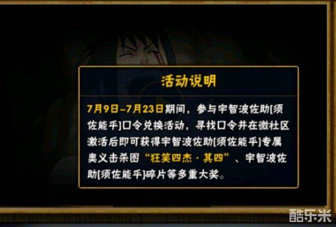 活动说明:7.9日—7.23期间,寻找口令并在微社区即可获得宇智波佐助专属奥义击杀图、碎片等大奖,游戏里佐助的专属活动,找到奥义图,然后点击详情,输入口令就可以了。