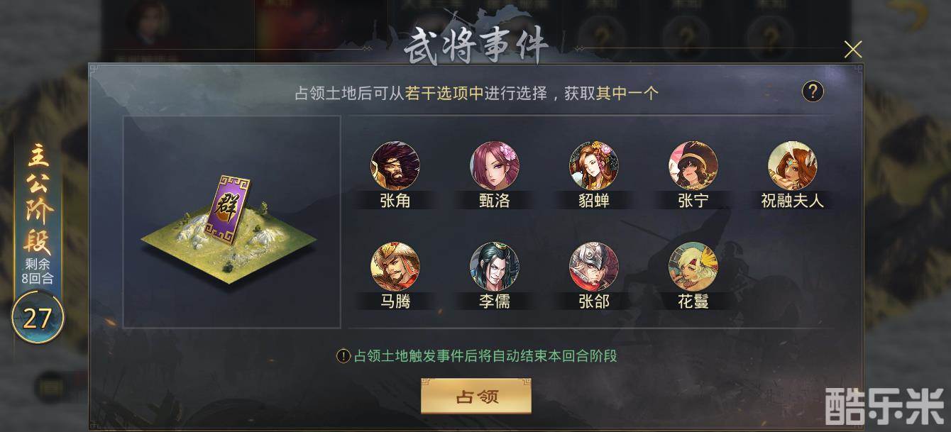 每次占领土地,触发武将或战法事件时,需从多个选项中进行选择,然后获得其中1个。