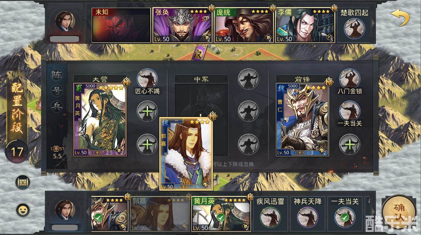 双方各行动10回合后,需在90秒内根据获得的武将和战法,配置自己的部队。