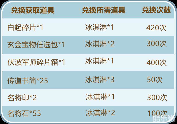「冰淇淋」可用来兑换白起碎片、玄金宝物任选包、伏波军师碎片箱等稀有资源: