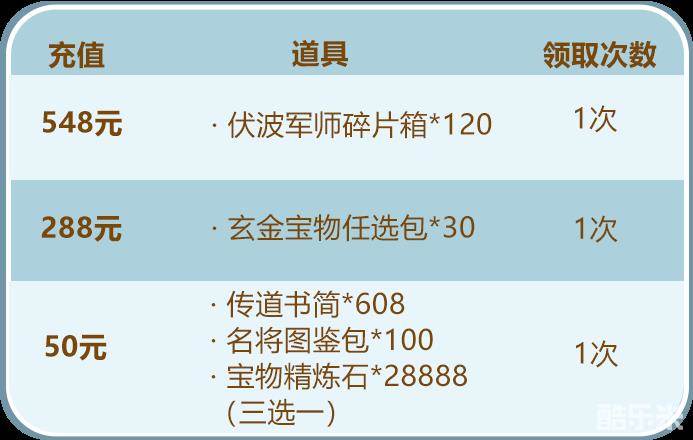在活动期间少年们单笔充值至指定金额,即可获得白起碎片、玄金宝物任选包、伏波军师碎片箱、传道书简、冰淇淋等资源: