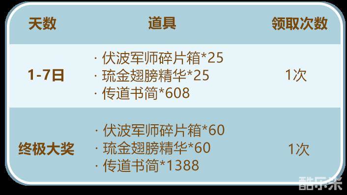 1-7日可领取:「伏波军师碎片箱」*25 或 「琉金翅膀精华」*25 或「传道书简」*608