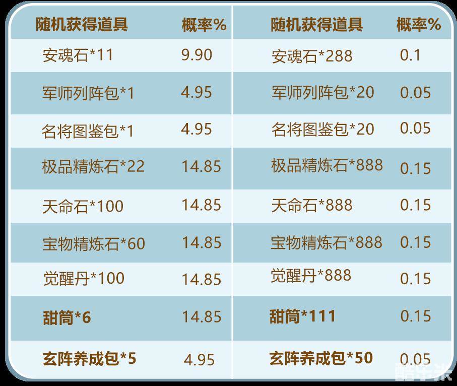 3.「暑期礼盒」可开出:甜筒*111、玄阵养成包*50、觉醒丹*888、天命石*888、极品精炼石*888、安魂石*666、军师列阵包*40、名将图鉴包*40、宝物精炼石*888、甜筒*6、玄阵养成包*5、觉醒丹*100、天命石*100、极品精炼石*22、安魂石*11、军师列阵包*1、名将图鉴包*1、宝物精炼石*60中的随机1种。