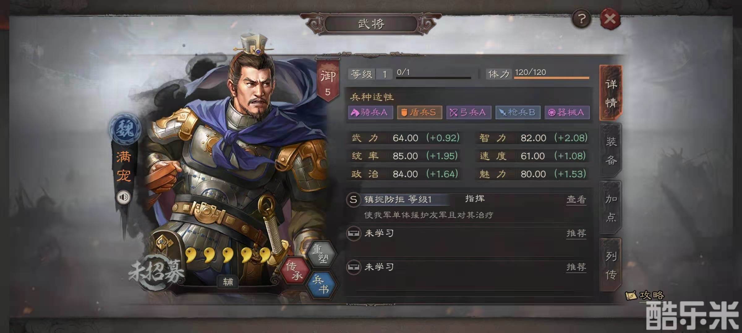满宠在三国志战略版中魏国的武将,擅长的兵种是盾兵,面板属性中智力比较占优势,初始值为82点,成长是2.08,统率值初始是85点,成长是1.95点。所以说满宠的防御能力还是很好的,但是依靠这些智力去输出的话,就有点捉襟见肘了。满宠的自带战法是镇扼防拒,效果是每个回合都会有几率为我方单体武将援护所有友军,并且获得修整状态,同时也使得被选中的己方武将在被攻击的时候,有几率移除伤害来源的一个增益状态。