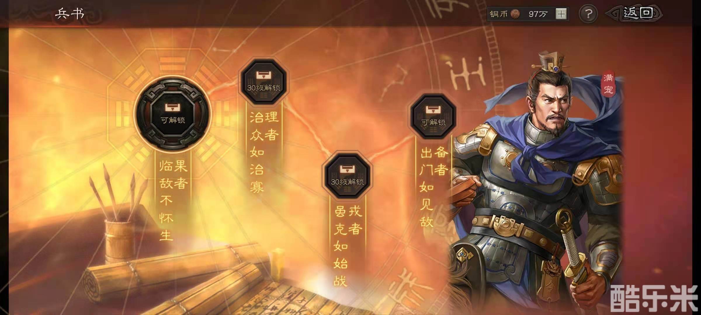 从满宠的战法和属性来看,满宠还是偏向辅助和防御类型的,所以在兵书的选择上也要遵循这一点,满宠可以携带四本兵书,小编选择的分别是九变,援其必攻、励军和救主,这几个兵书都是强化的辅助能力。其中九变的效果是在武将每进阶一次的时候,就能提升自身造成的兵刃伤害和,谋略伤害,受到的谋略伤害和兵刃伤害降低。