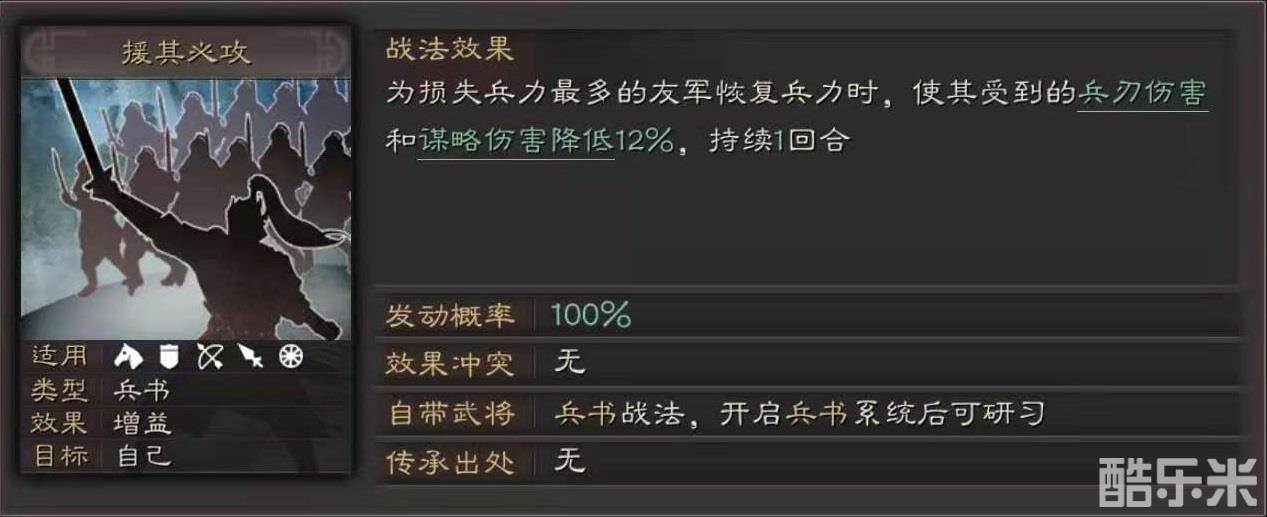 这一本兵书是比较常规的类型,适配性非常好,给满宠使用也是可以的,伤害多一些当然是有好处的了。援其必攻的效果是在为损失兵力最多的友军恢复兵力的时候,使治疗目标受到的兵刃伤害和谋略伤害降低12%。满宠的智力不低,治疗加成还是很高的,有了这个技能,不仅可以回血,还能减伤,辅助效果更好了。