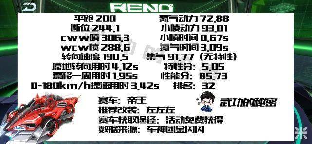 帝王的CWW速度有306,跟月光女神相差不大。整车的赛车排名在月光女神之前,当然只高出她一名。赛车的推荐改装为全左,这辆车的改装科技点也可以通过获得这辆车的途径中的专属科技点去改装。