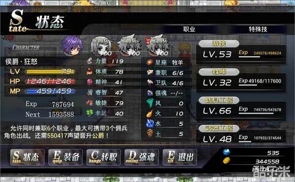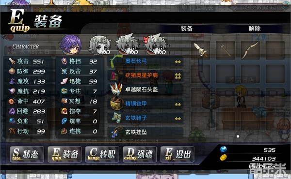 人物以及佣兵装备的操作,都在这个界面进行,比如装备物品、卸下物品。还可以看到你和佣兵的基本状态,如攻击力、防御力、魔法攻击、魔法抗性等等!