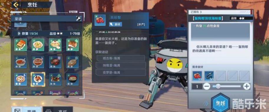 烹饪这个料理的配方为:1寄居蟹+1雷鳗
