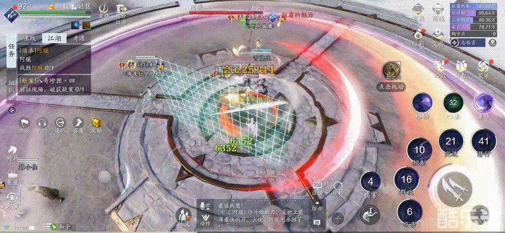狂风卷:阿暖释放剑刃风暴,造成全屏伤害,此技能为紫圈技能,需要少侠第一时间格挡。下面便是错误示范,硬吃技能伤害还是很高的。