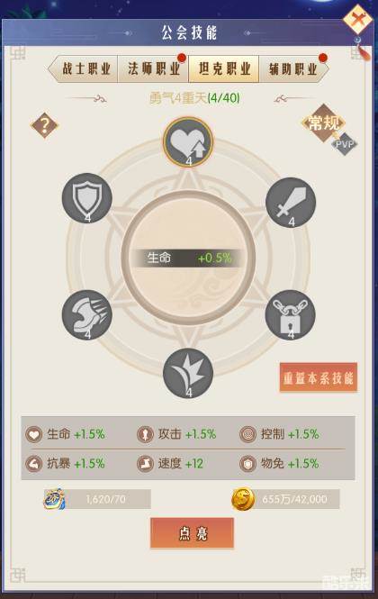 公会技能主要分为4个职业对应的升级路线,分别是战士、法师、坦克、辅助4个职业,对应技能只对对应职业有效,所以冒险者要选对职业再升级噢。