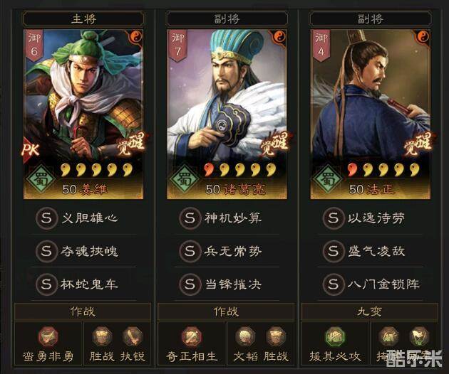 姜维:义胆雄心+夺魂挟魄+杯蛇鬼车,搭配蛮勇非勇和胜战+执锐