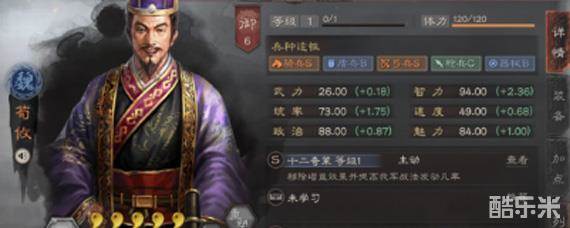 荀攸,是曹操的幕僚,阵营为魏。在游戏中属于5星将领,定位和辅助差不多。自带战法为”十二奇策“,不仅能够效除敌方1-2人身上的增益BUFF,还可以提高己方全体一个回合2.5%的战法发动概率,而且在下次发起主动战法时,还会对单体敌人打出谋略伤害,伤害率为51%。