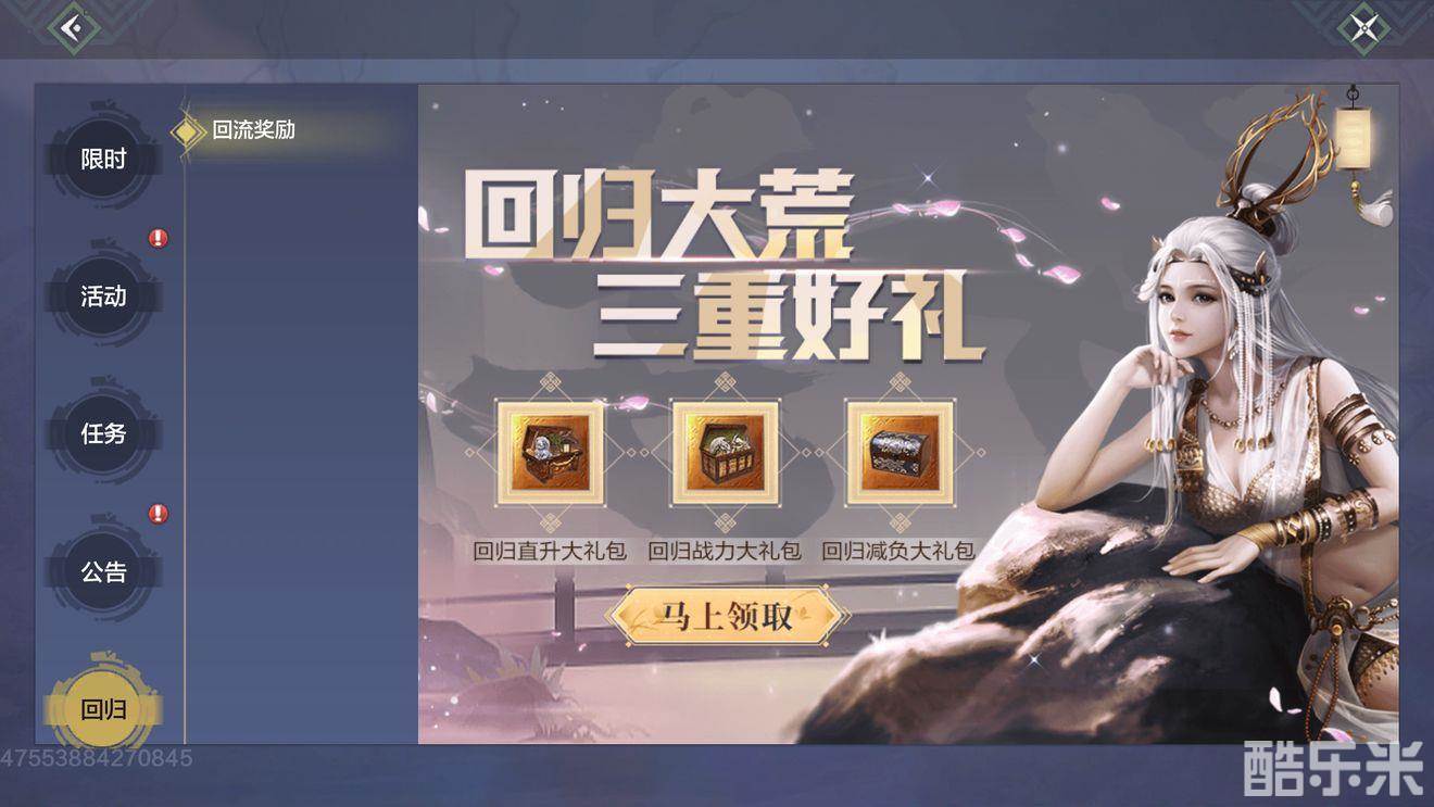 符合要求的回归旅者的进入游戏后可在游戏主界面寻得【福利】-【回归】页签,即可正式参与回归活动。活动时间结束后,活动入口将自动消失,别忘记领取奖励哦~
