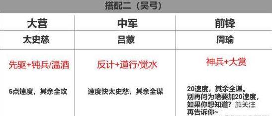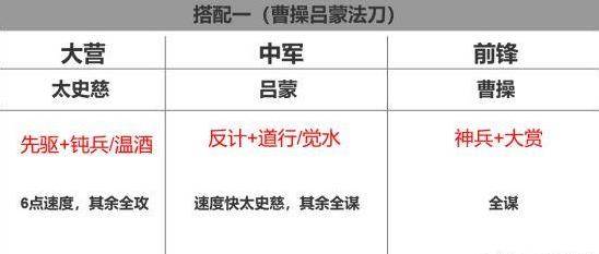 队伍点评:算是法刀的变种的,大营用太史慈替代王异,虽爆发没有王异高,但是其伤害也不容小觑,前三回合如果对面没有战必,2回合直接打穿。太史慈先驱前三回合稳定的输出,这队物理打谁基本都不虚,当然,如果遇到垒石的周泰,还是躲着点。